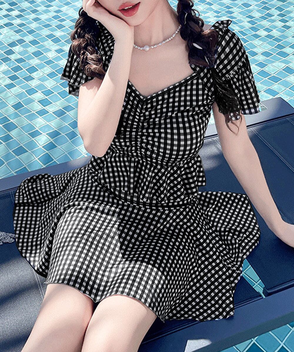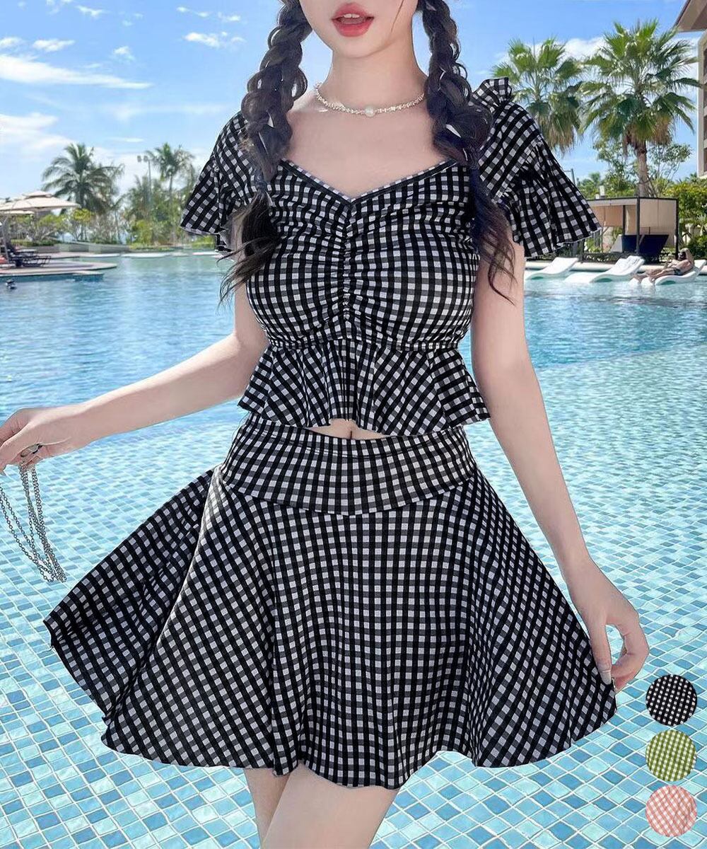 フリルトップス ハイウエストスカート 体型カバー水着セット 大人可愛い チェック柄セパレート水着 露出控えめ水着ガーリー