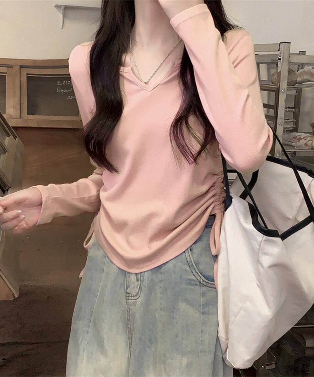 長袖カットソーレディース サイドスピンドル シンプルトップス Vネックショート丈tシャツ 着やせ カジュアルプルオーバー