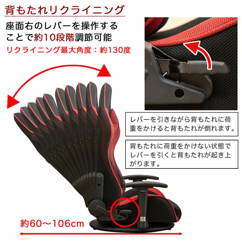 背もたれはレバー操作でリクライニング出来ます(10段階・最大約130度)